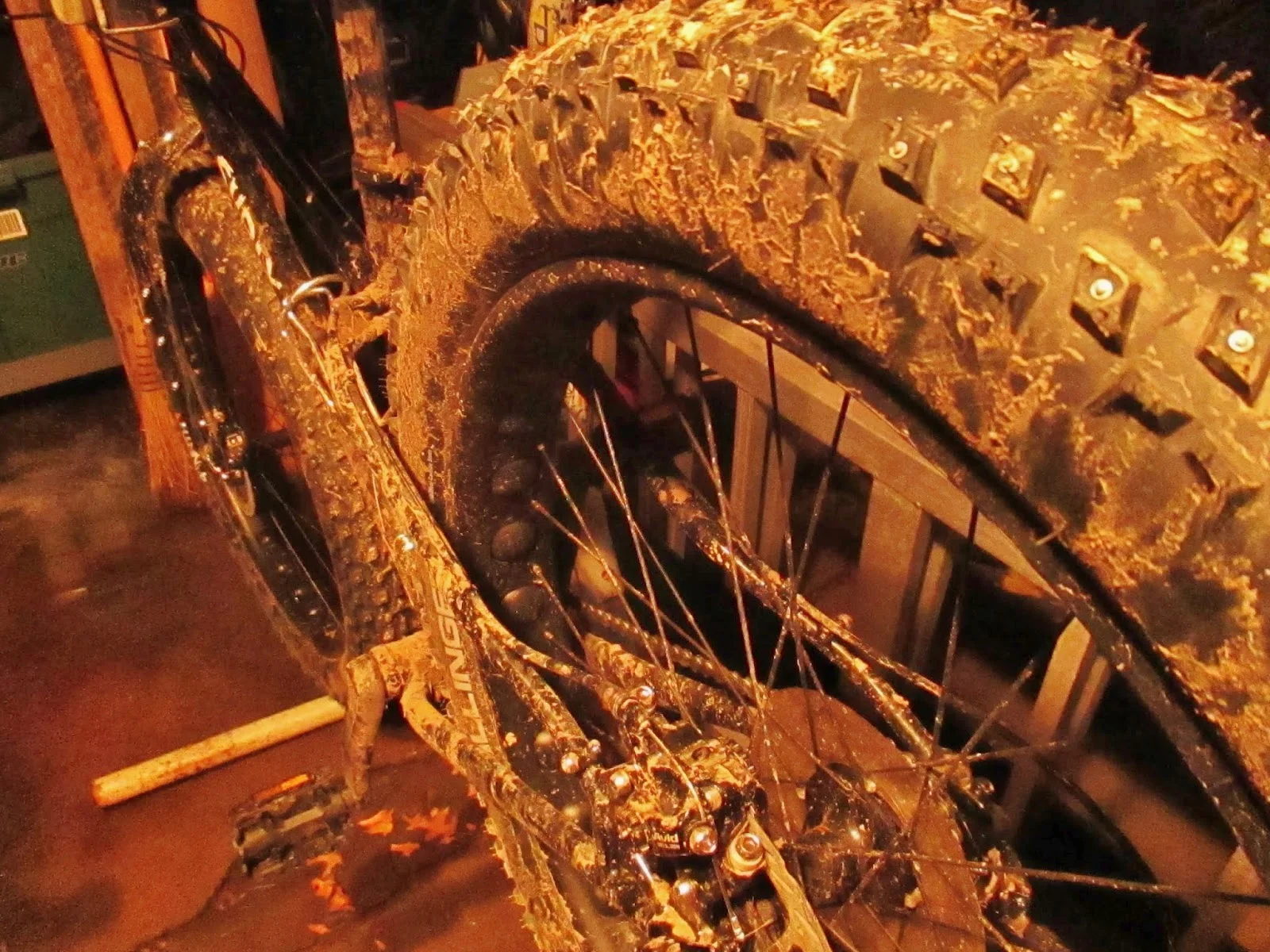 On the way out from the trailhead I encountered extreme mud and ice. There were sections that I had to slog through mud and water and push the Pugsley. I still have the studded tires on the bike. There were also sections of ice that were rideable and the studs were required. Once again the ride started out in the late sun of the afternoon and ended with the headlamps and dark ride back to the truck. Good Times!!