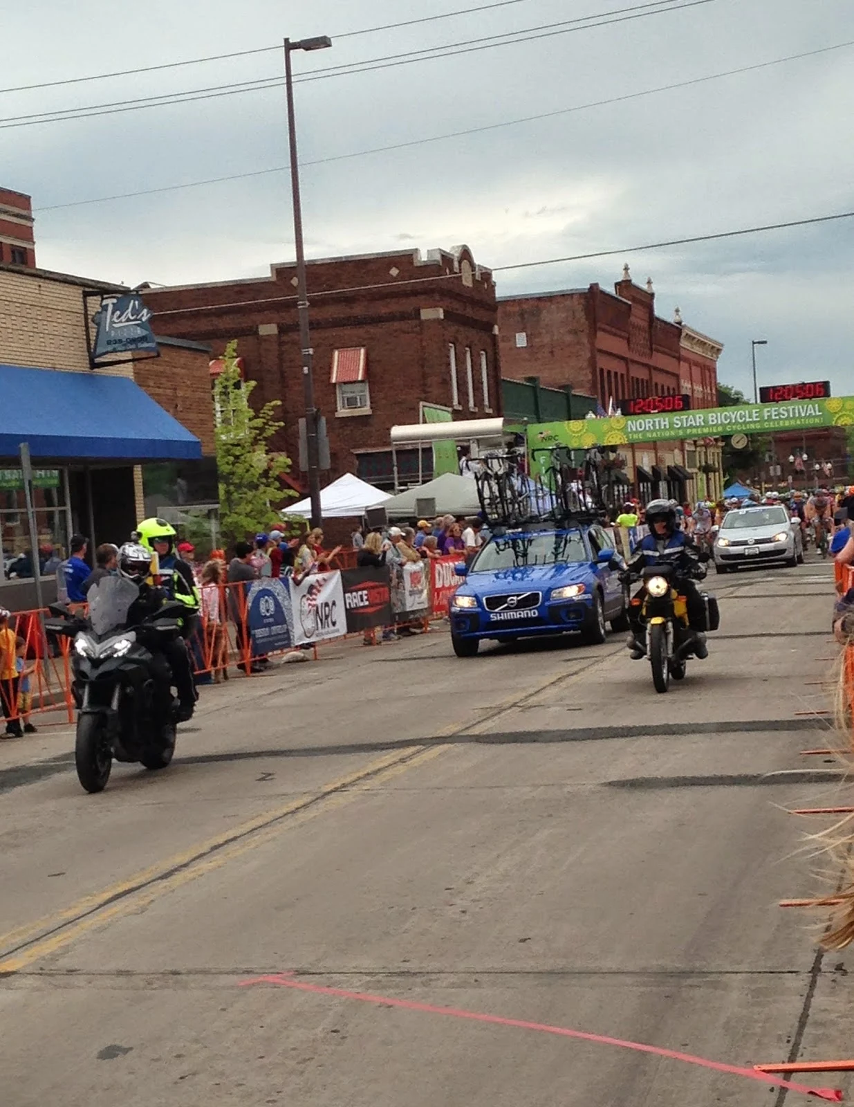 I am piloting the BMW behind the lead rider that created a 4 minute gap on the pack. She was caught and as the race progressed there would be several attempts of riders to get away. The group of over 100 racers would be split up into several groups, but it would be a pack that would race into Menomonie for the finish.